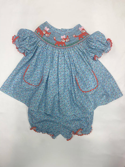 Conjunto de 2 piezas de blusa y bombachos de verano, bordada con puntada smock sobre tela con lunares fondo celeste, algodón puro, mangas abullonadas, bordado de zorro hecho a mano, tela suave, fina y súper transpirable, perfecto para niñas en verano
