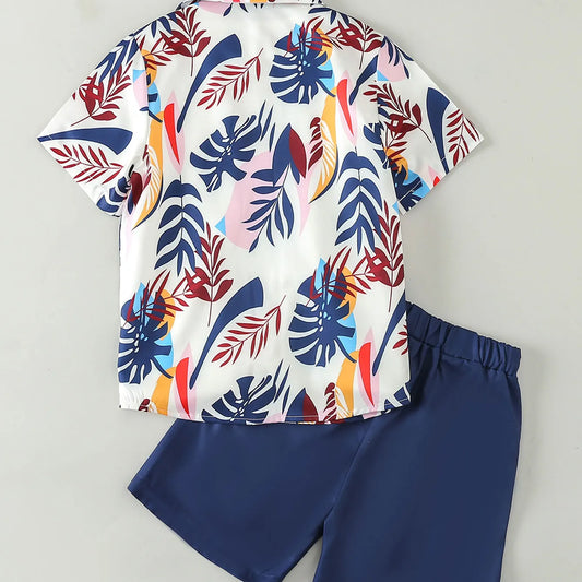 Conjunto de camisa de manga corta con estampado de hojas de palma y short, para verano para niños y adolescentes