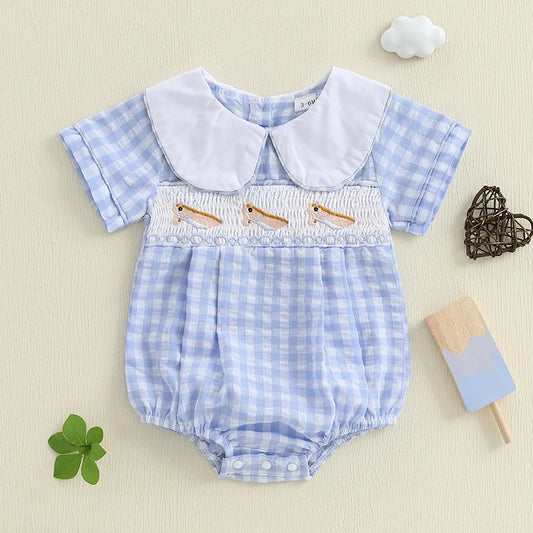 Pelele de verano para niña, corte holgado, velero bordado a cuadros, cuello de muñeca ahumado, mono infantil de manga corta