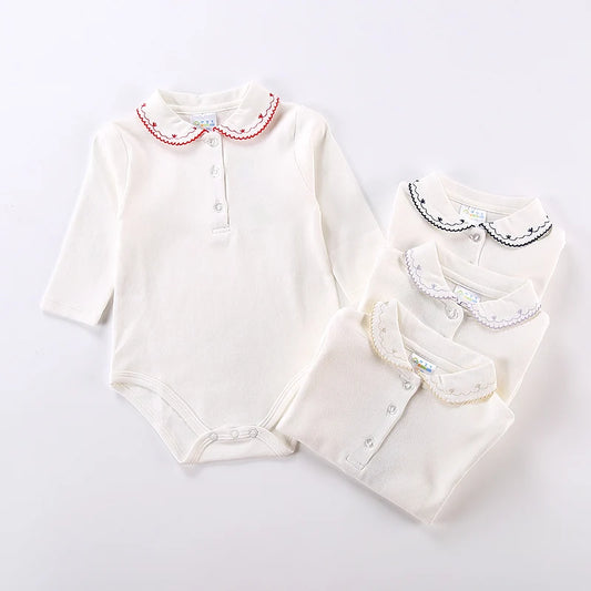 Hermosos peleles blancos con cuello bordado para bebé, camisa de algodón de manga larga para primavera y otoño