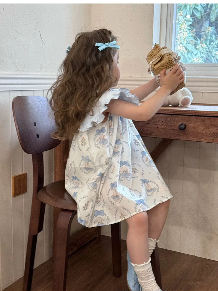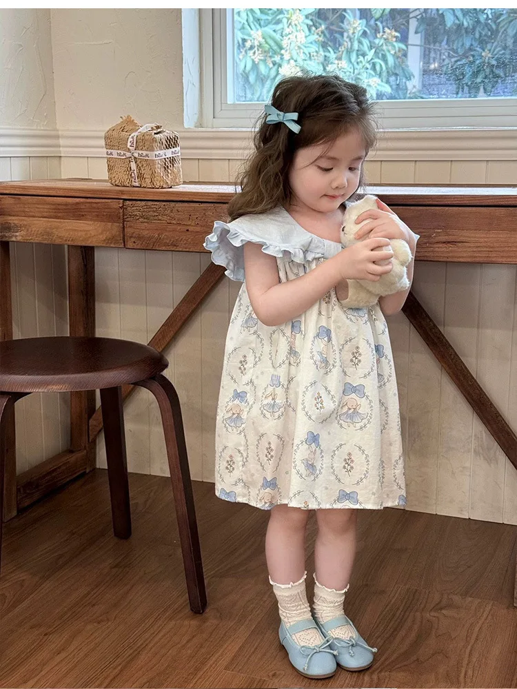 Precioso vestido vintage para niña con amplio cuello terminación en volante en algodón, especial para verano