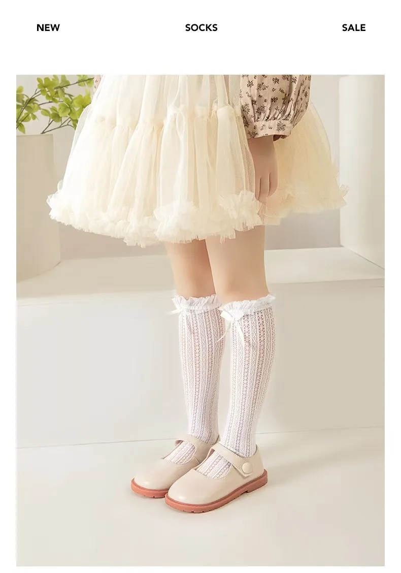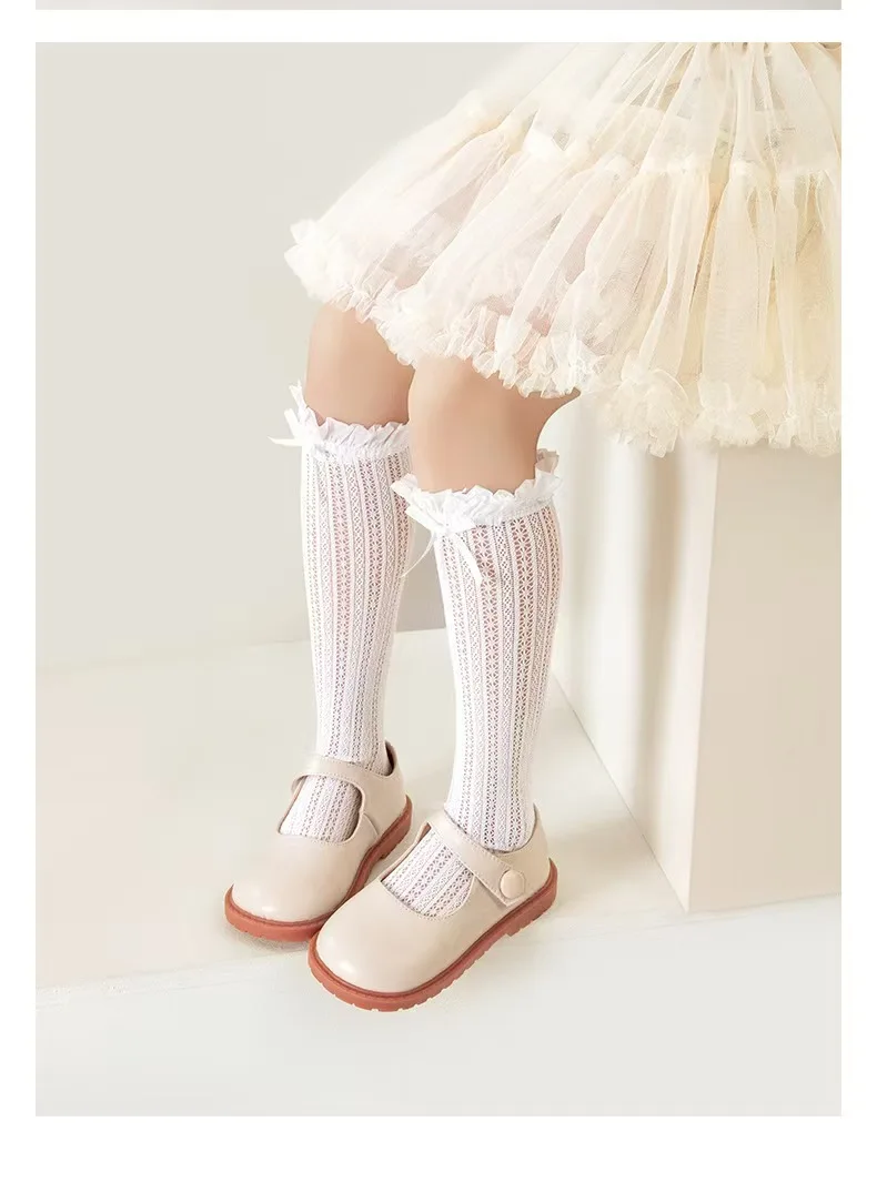 Calcetines hasta la rodilla de seda de encaje blanco Lolita, medias de rejilla caladas con lazo de ganchillo Floral, diseño de volantes, calcetines para padres e hijos