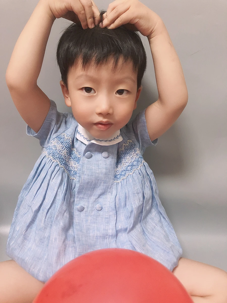 Merveilleuse barboteuse brodée à la main en point smocké de style vintage, boutique de mode espagnole pour bébé et enfant, lin à manches courtes pour l'été