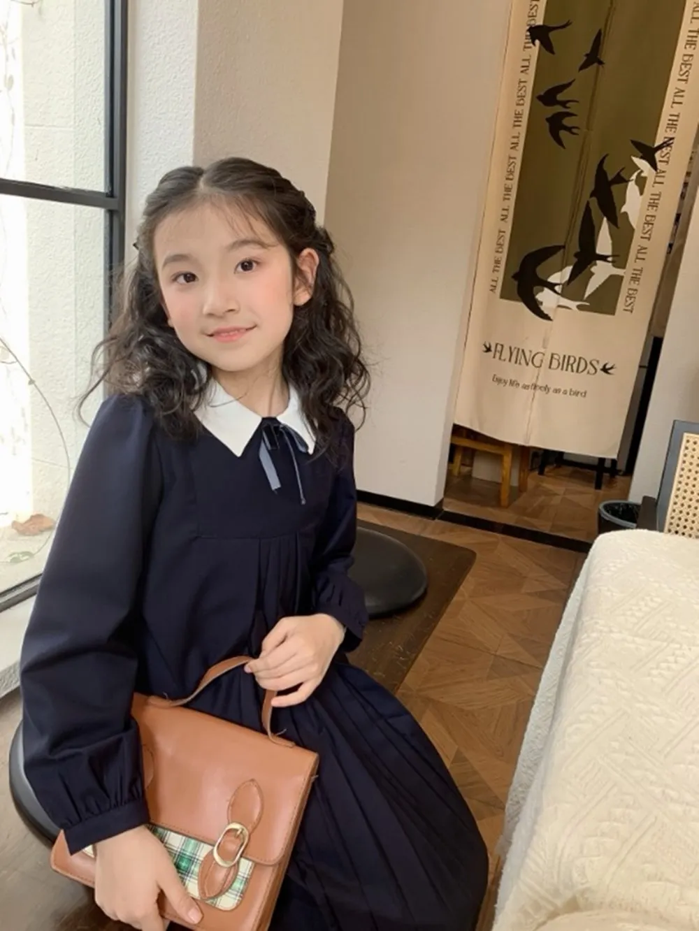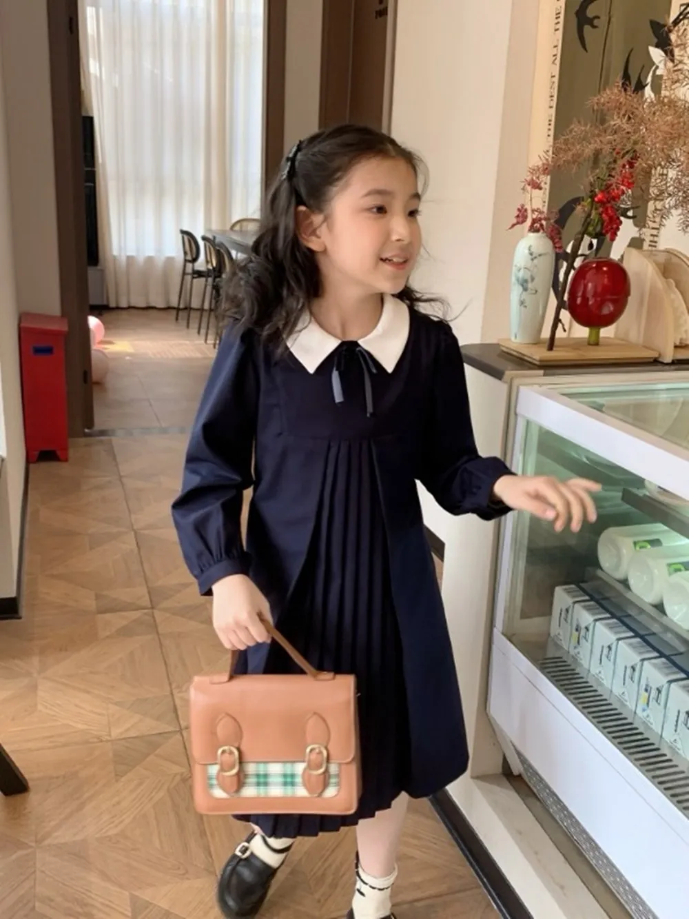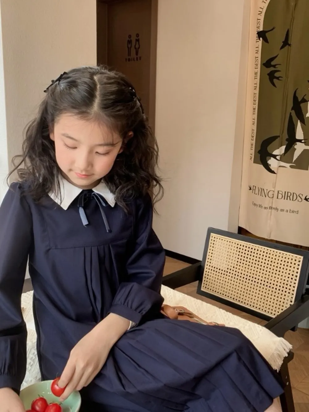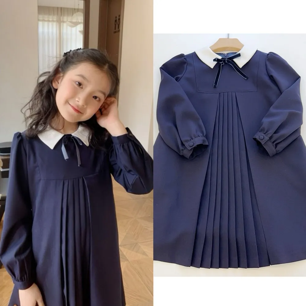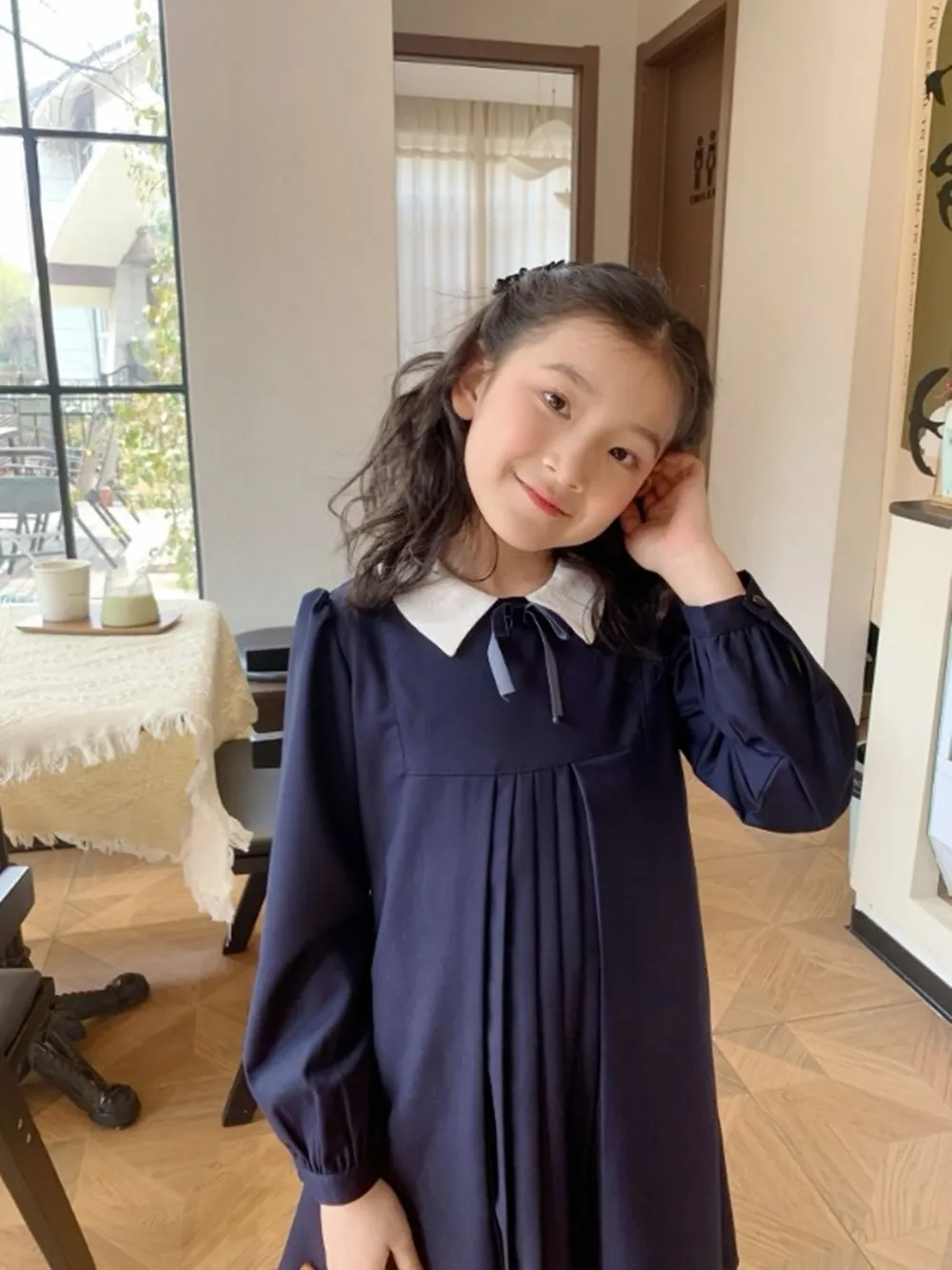 Vestidos de niña estilo estudiante, color azul marino, vestido de manga larga para primavera y otoño