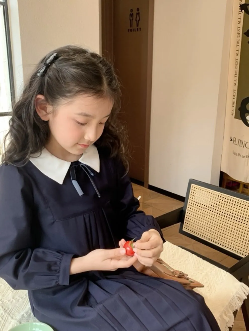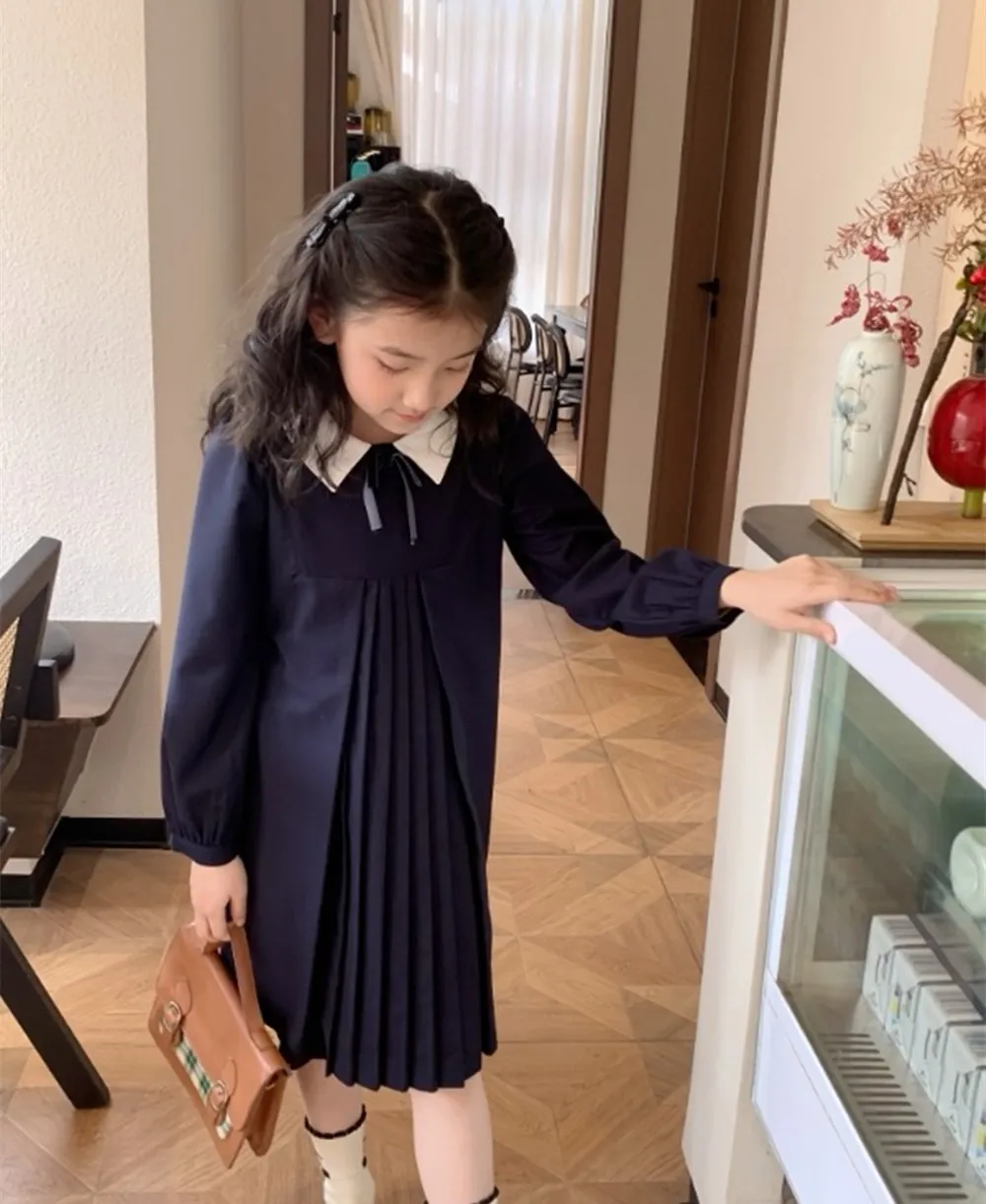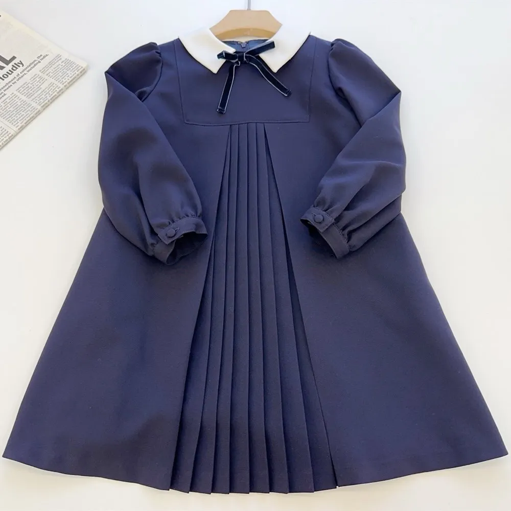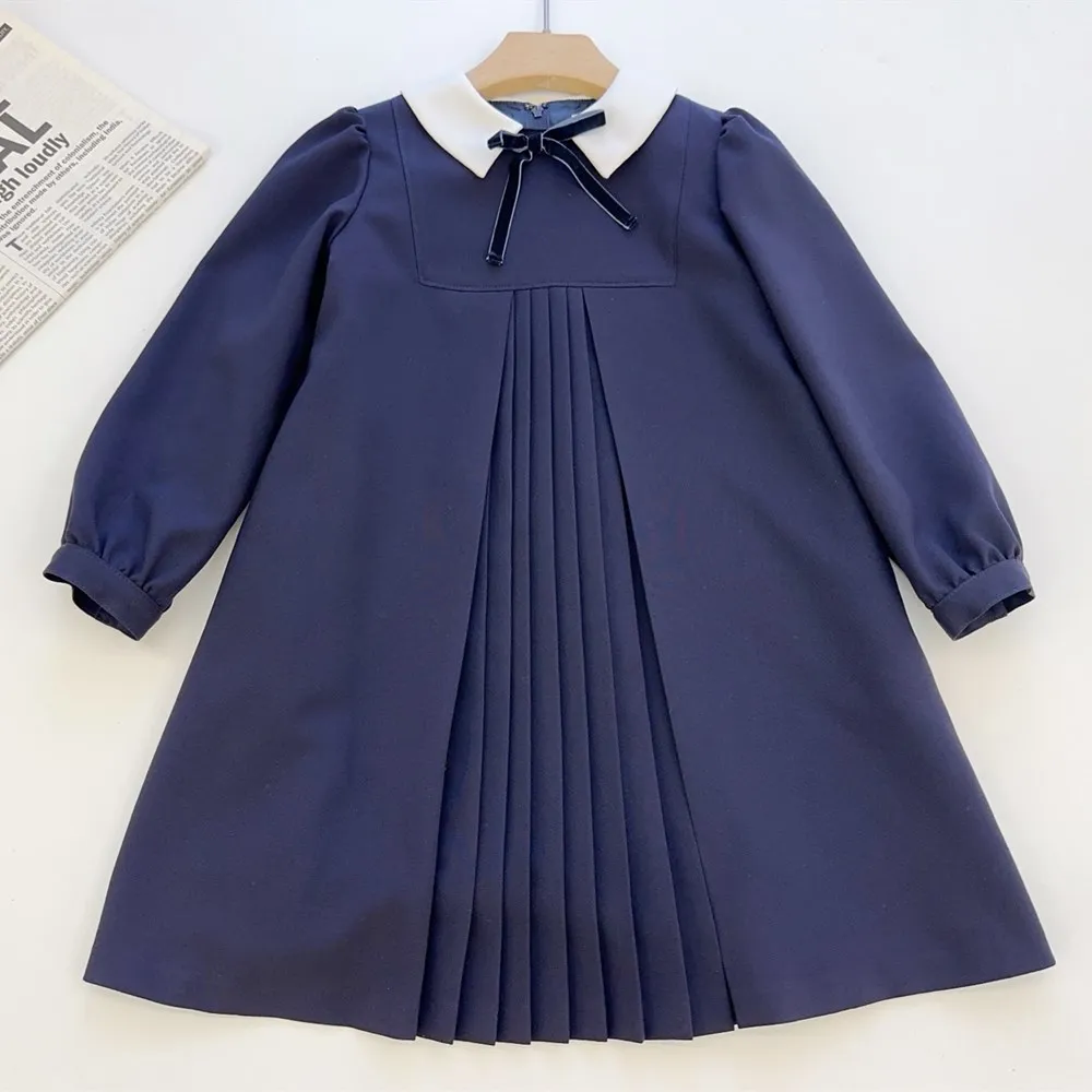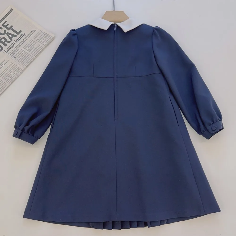 Vestidos de niña estilo estudiante, color azul marino, vestido de manga larga para primavera y otoño