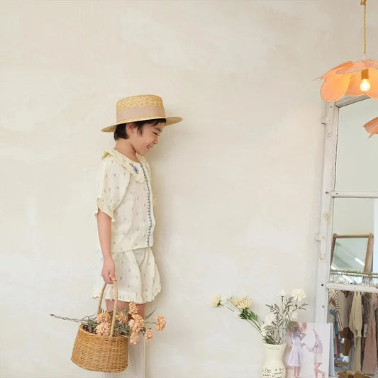 Conjuntos de verano para niñas, bordados estilo pastorales, campestres y retro, colores pasteles, short, faldas, jardineras y blusas,