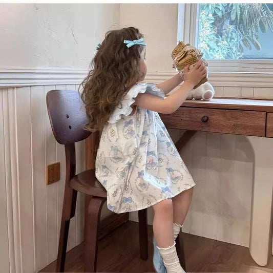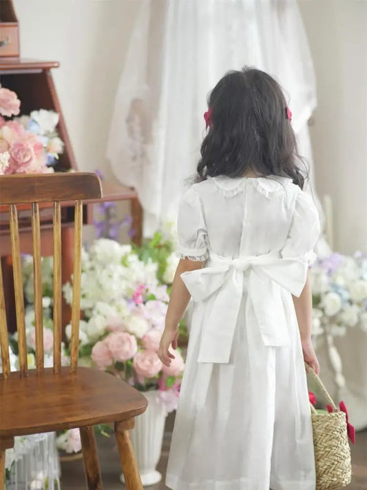 Precioso vestido vintage para niña con amplio cuello terminación en volante en algodón, especial para verano