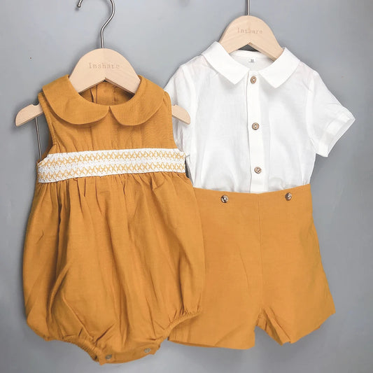 Ropa moda española de boutique para niños, pelele amarillo de verano para niñas, bordado, conjunto de lino y algodón de manga corta,conjunto para hermana y hermano