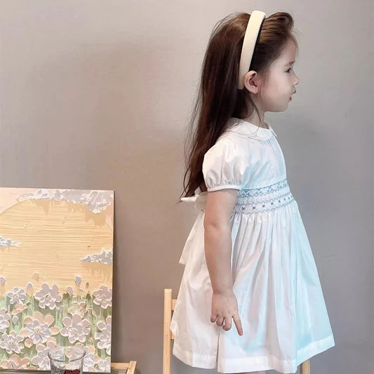 Vestido blanco de verano para niñas estilo español bordado punto smock hecho a mano, con bombacho a juego, para cumpleaños, fiesta y bautizo