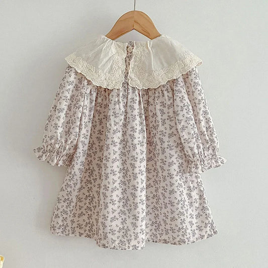 Vestido para niñas con estampado de flores, cuello amplio y bordado color crudo, de manga larga para primavera y otoño