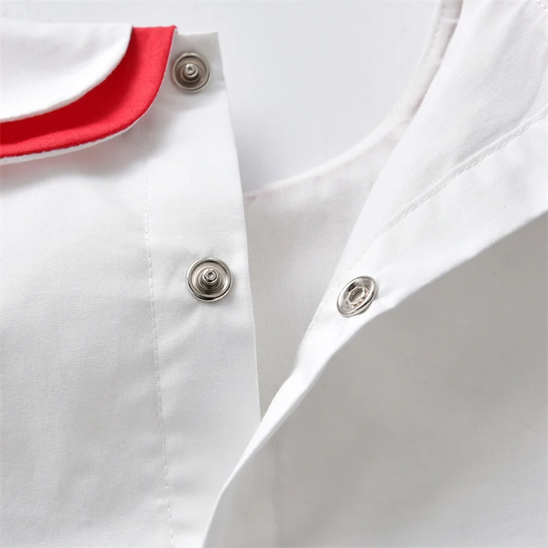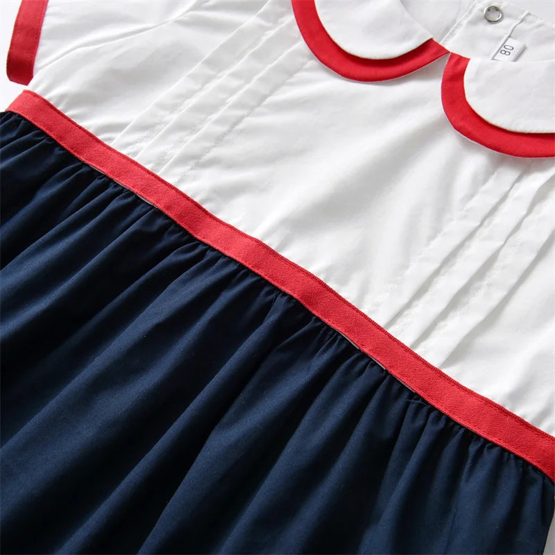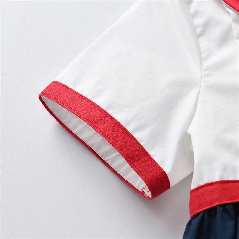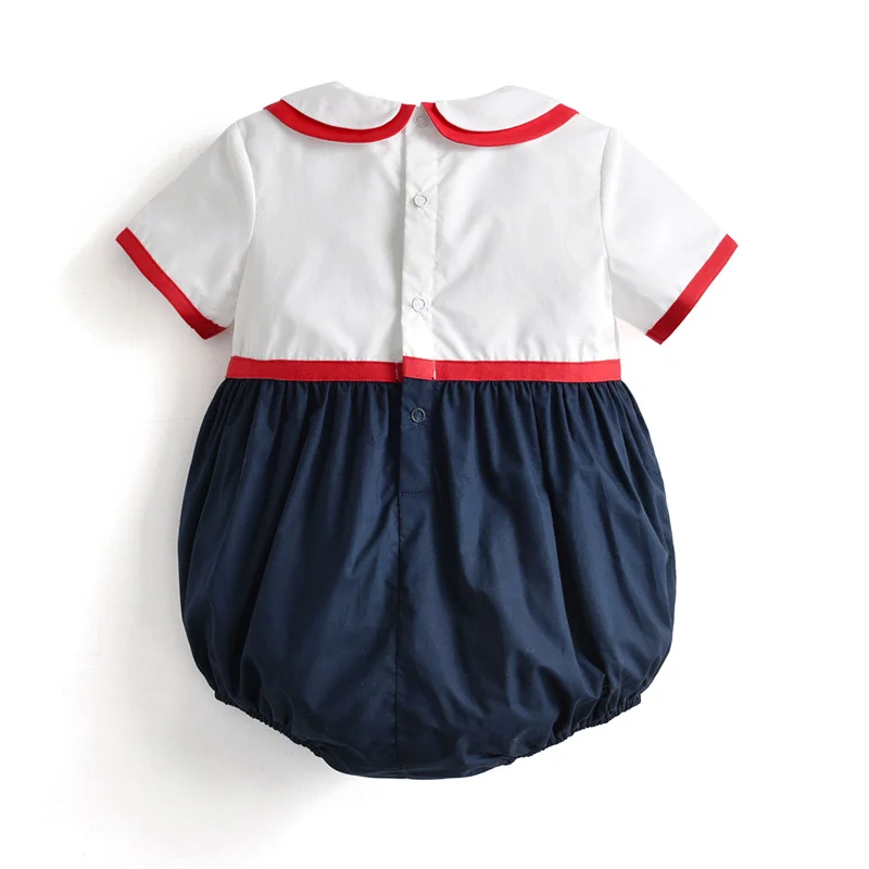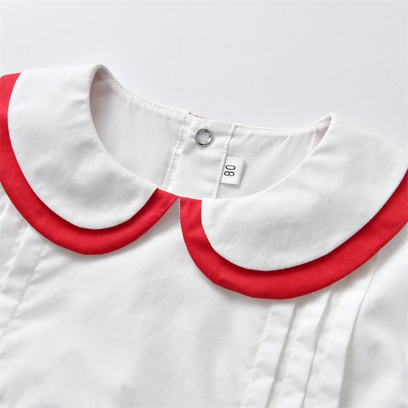 Baby Short Sleeve Rompers+ Girls Patchwork Dress,Peter Pan Collar,Red trim.