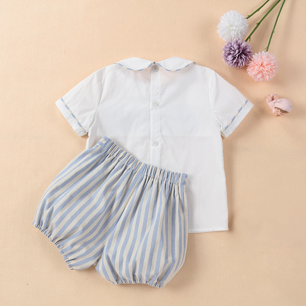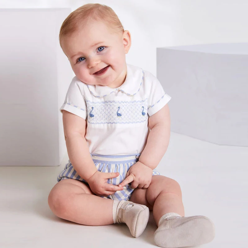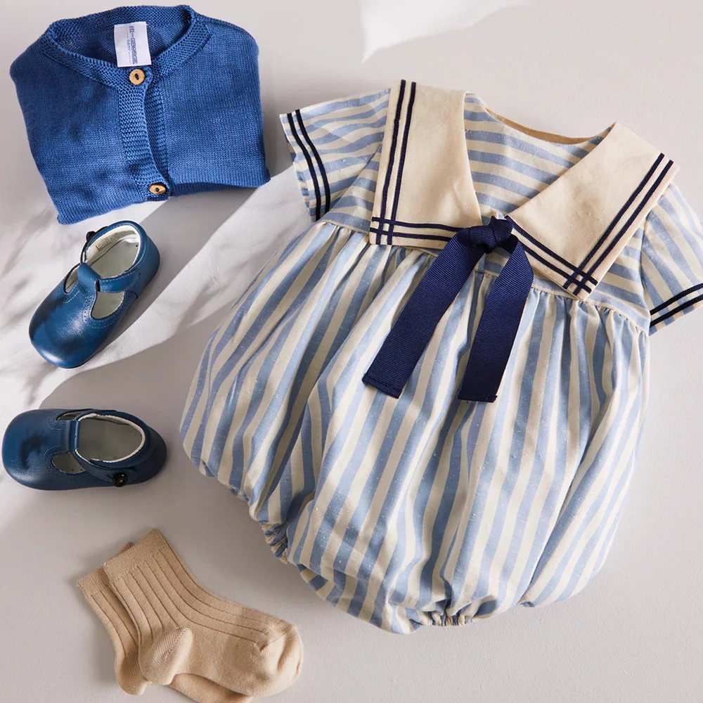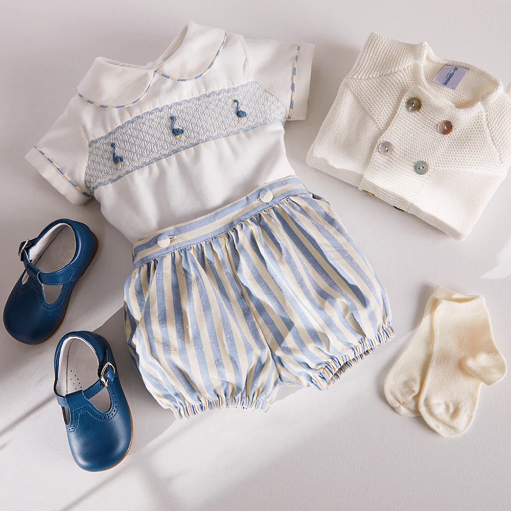 Hermosos outfit en juego para hermanos, bebés y niños, moda de boutique española, vestido, bombacho, en algodón rayado celeste, cuello marinero y lazo, bordado punto smock, hecho a mano