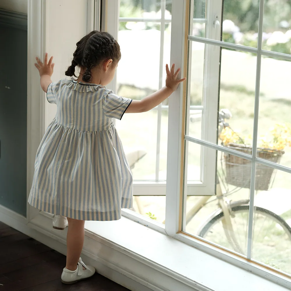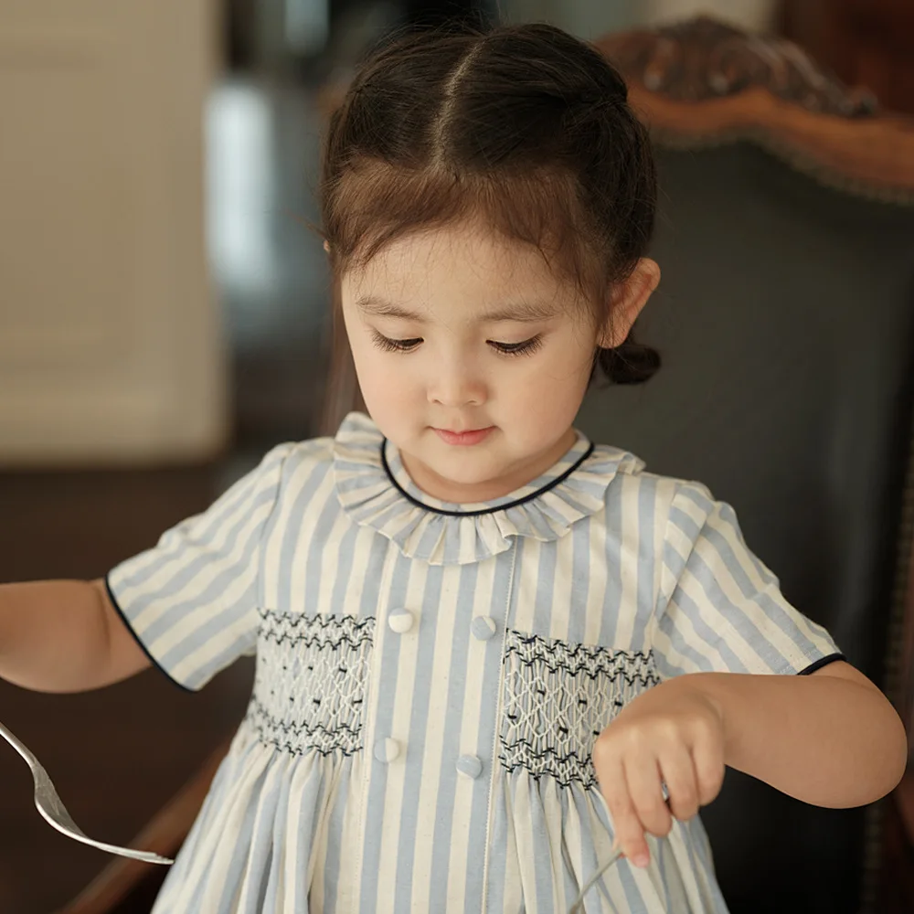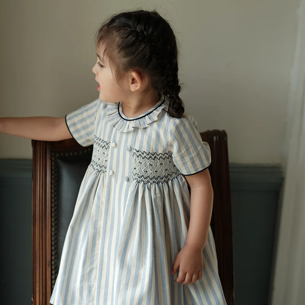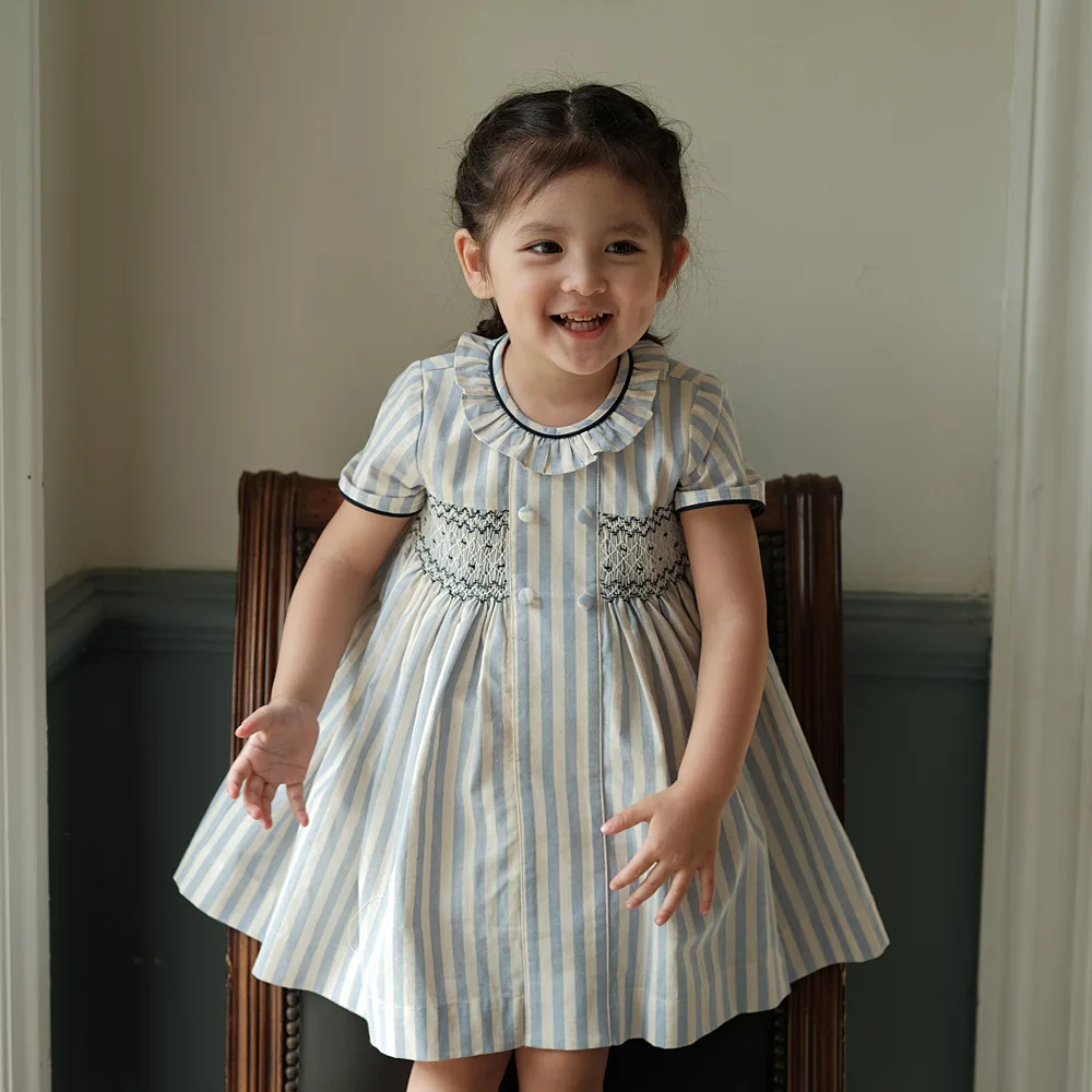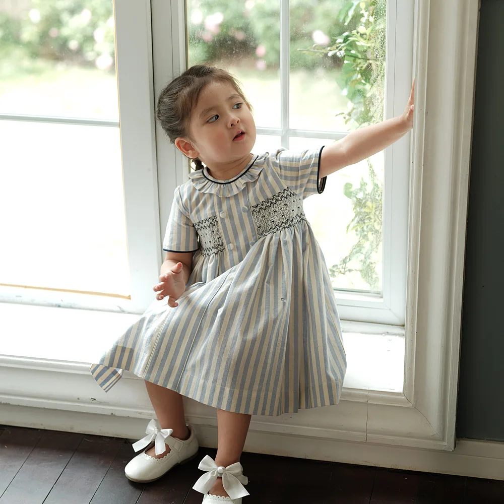 Vestido para niña, estilo moda española de alta gama, bordado punto smock y botones sobre rayas, ribete azul marino, traje de algodón de manga corta, para vacaciones de primavera y verano